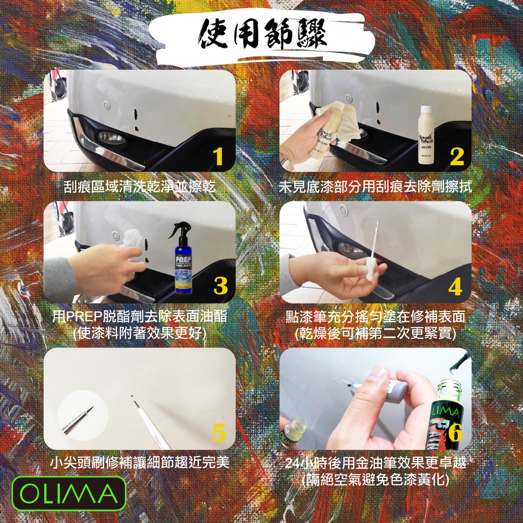 .清除修補表面的水份及油汙,建議可使用OLIMA PRE鍍膜前導劑(脫酯劑) 好完全去除表面油酯讓後續補漆筆附著越好