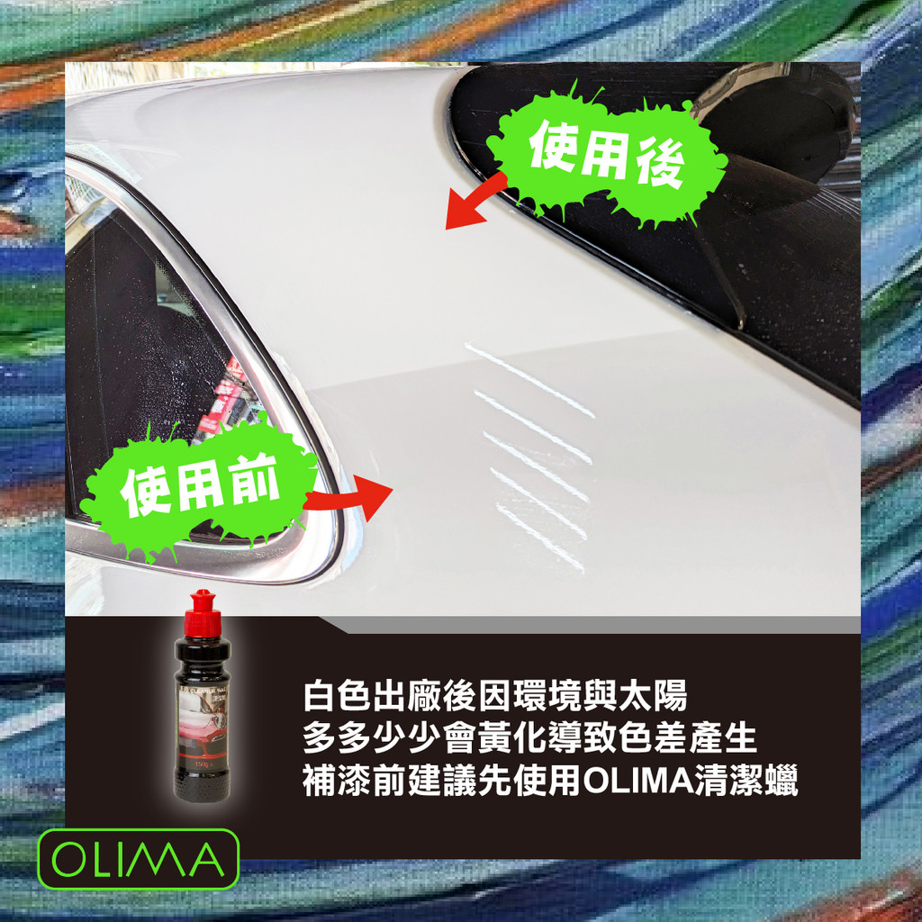 .白色車漆可以先使用OLIMA清潔蠟 將原本的變黃漆面修正